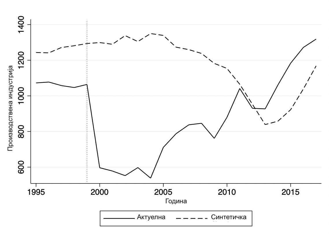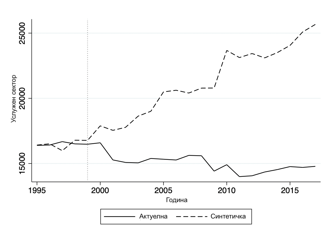 По графиконите 3 и 4, на кои се претставени секторот на услуги и производствената индустрија, се забележува значителен тренд на деиндустријализација – со ниска статистичка значајност (п-вредност > 0,1 за двата модела). Варијаблата на исходот за која се моделира синтетичкиот ефект е различна за услужниот сектор (додатна вредност по работник) и за производствената индустрија (додатна вредност кон БДП). Не земајќи ја предвид статистичката значајност, синтетичката држава во однос на услужниот сектор, која е составена од државите Бугарија (42,5 %), Романија (37,8 %) и Кипар (19,7 %), е доволно силен доказ дека ќе постои висока веројатност за деиндустријализација и раст на услужниот сектор по влезот на Северна Македонија во ЕУ. Од овие причини, економската (фискална) политика ќе игра улога за тоа како трудот и претприемништвата реагираат кон овие шокови на пазарот. Целната стимулација има потенцијал да оспособи економии на обем, кои ќе се проследат со компаративна предност во однос на производителите од други држави кои губат чекор (lag behind). Економиите на обем исто така бидат поддржани од истражувачките (R&D) буџети на ЕУ, од кои две третини се определени кон истражувања и напредок на производствените индустрии (Vengelers, 2013) – придонесувајќи дополнителна продуктивност на трудот преку (патентирани) технолошки напредоци.