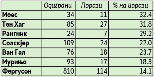 Она што е уште поинтересно е што откако постои Премиер лигата, Ерик тен Хаг е тренерот на Манчестер Јунајтед со втор најлош резултат според процентот на порази од вкупниот број натпревари што ги водел како менаџер. Полош од него е само Дејвид Моес.