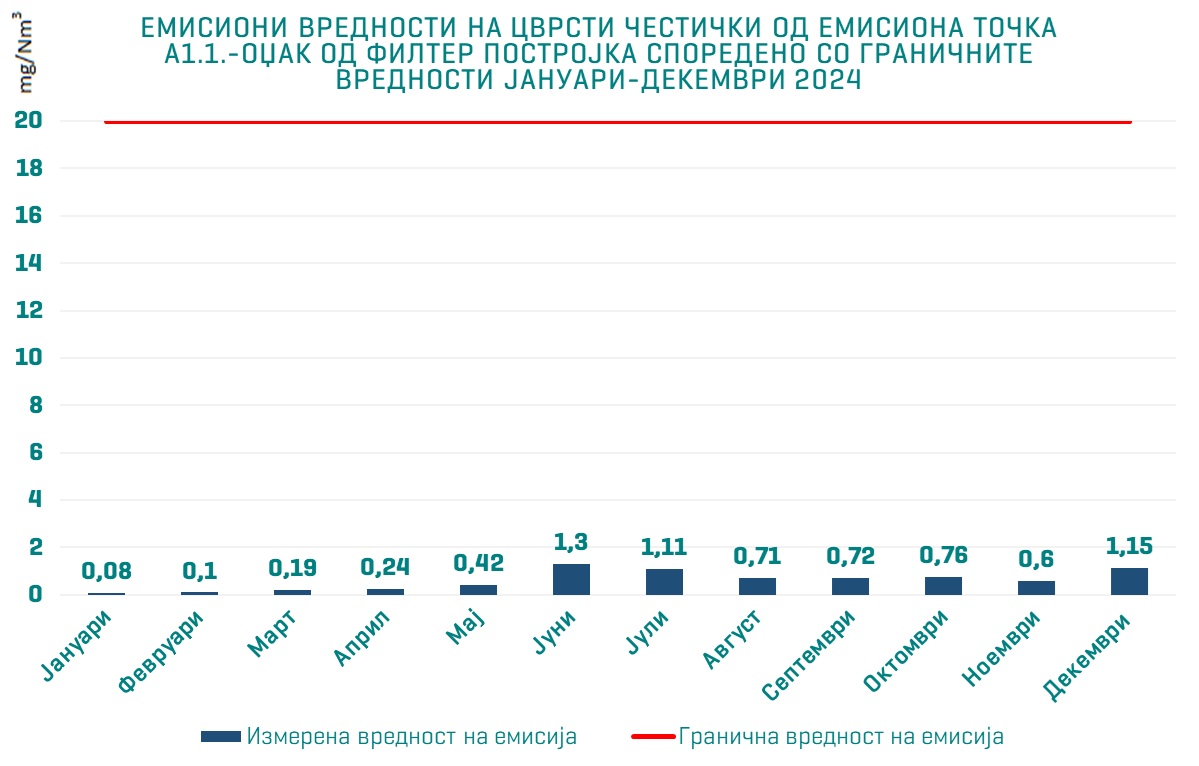 Во прилог на ова соопштение е пресекот на емисионите вредности на цврсти честички од двете мерни точки за цела 2024 годинa, каде што се гледа дека во текот на сите месеци кога активно работи компанијата, тие се значително пониски од граничните вредности.