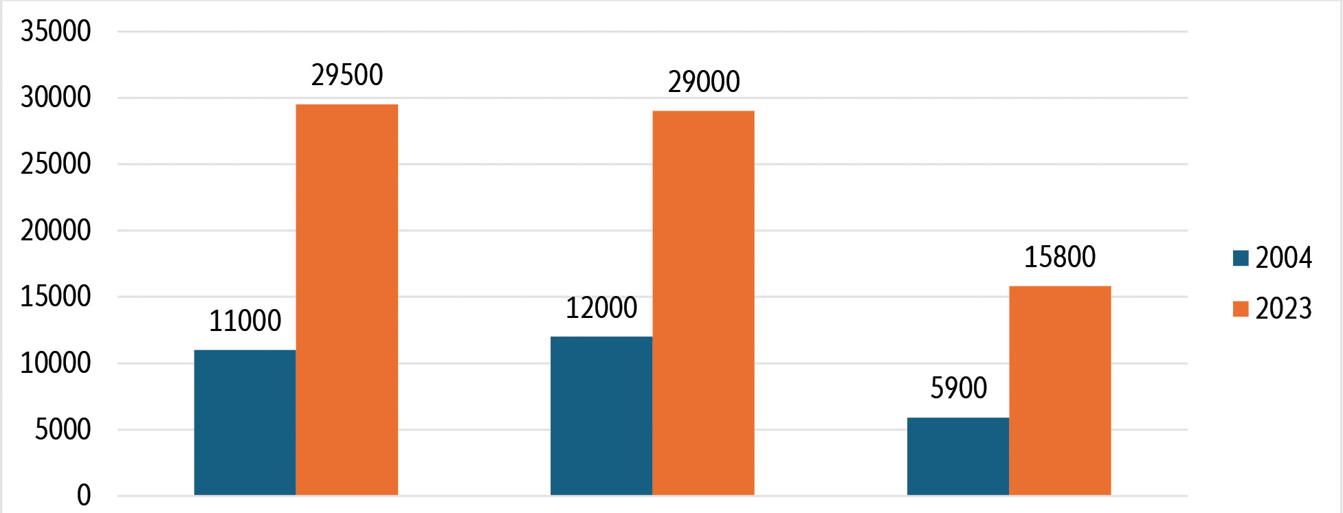 Графикон бр. 2 БДП по жител (во евра, според паритет на куповна моќ) во 2004 и во 2023 година