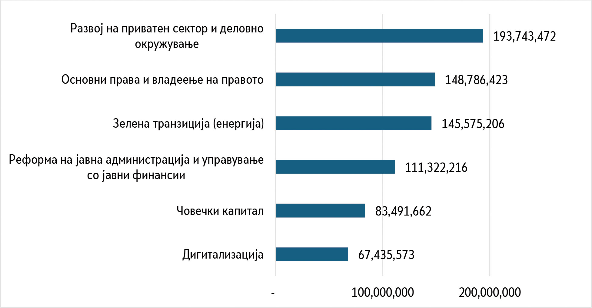 Реформската агенда за нашава држава предвидува 37 реформи и 136 реформски чекори групирани во 5 области и 18 подобласти во доменот на: (1) реформа на јавната администрација и управување со јавните финансии, (2) енергетска и дигитална транзиција, (3) човечки капитал, (4) развој на приватниот сектор и деловното окружување и, бездруго најтешката област, (5) фундаментални реформи и владеење на правото (графикон бр. 4). Секоја реформа има прецизно утврдена динамика и парична сума која ќе се добие од Европската комисија доколку успешно се реализира реформата. Паричните износи за поддршка на реформите варираат од 2,1 милиони евра до 51,4 милиони евра по реформа. Финансиски најсилно поддржана реформа е онаа поврзана со управувањето со претпријатијата во државна сопственост со фокус на железничките и на поштенските услуги.