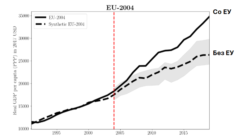 Придобивките од членството во ЕУ се многу поголеми отколку што обично мислиме. Академските истражувања во економијата покажуваат дека земјите од Централна и од Источна Европа, кои се приклучија кон ЕУ во 2004 година, бележат повисок БДП по жител од над 33 % (графикон бр. 1). Тоа е еквивалентно на дополнителни 7 670 евра годишно по жител.