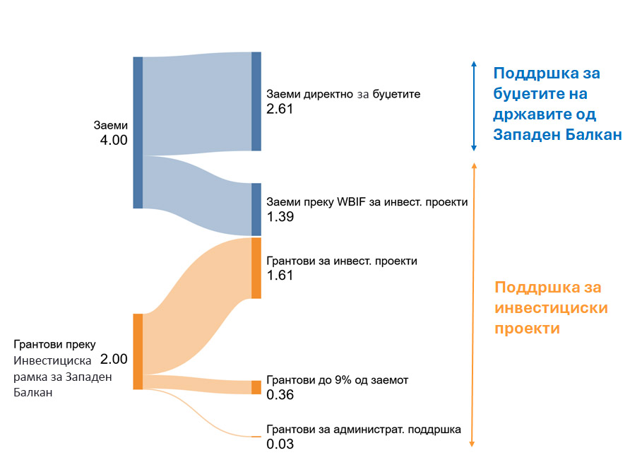 Планот за раст и Реформската агенда не претставуваат замена, туку надополнување на постојните механизми на ЕУ – пред сè, (1) реформските процеси предвидени со Спогодбата за стабилизација и асоцијација (ССА) и (2) можностите достапни преку инструментот за претпристапна помош (IPA III). Вкупната финансиска поддршка за целиот регион е 6 милијарди евра, од кои 2 милијарди евра се грантови, а 4 милијарди евра се заеми под исклучително поволни услови (графикон бр. 3).