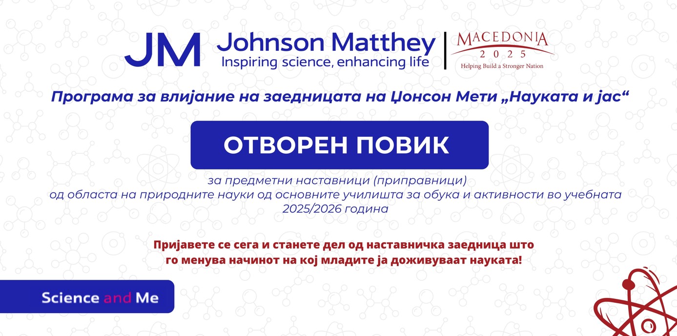Македонија2025, во рамки на Џонсон Мети Програмата за поддршка на заедницата„Науката и Јас“, го објавува новиот повик за предметни наставници по природни науки (природни науки, биологија, хемија, физика) од основните училишта во земјата.