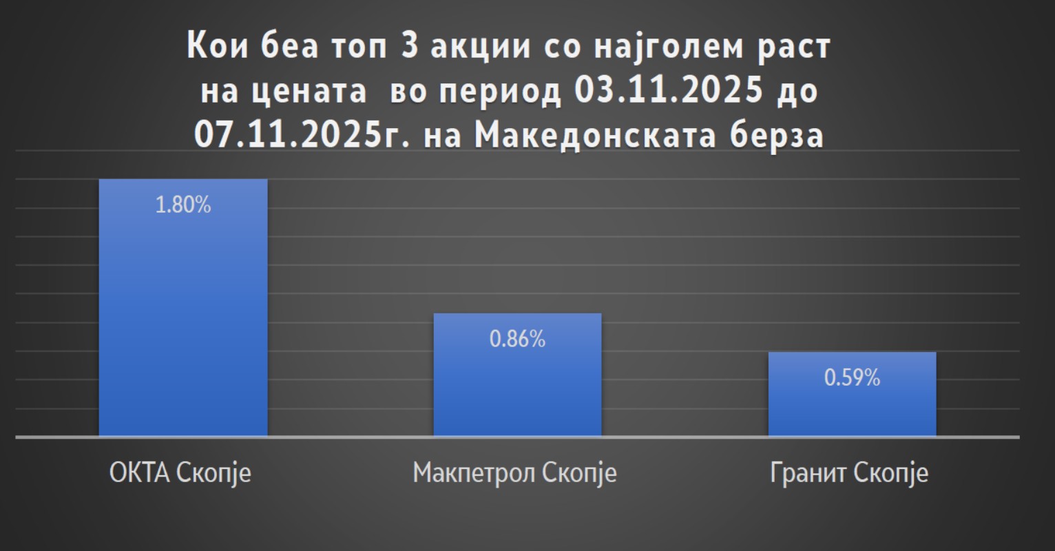 Минатата недела, во периодот од 03.11.2025 – 07.11.2025 година на Македонската берза на хартии од вредност вкупно на сите пазари (официјален и редовен пазар) беше остварен вкупен промет од 98,4 милиони денари или околу 1,6 милиони евра. Во однос на неделата пред оваа, ова е зголемување за 25,9 %. Најголем промет од 32,8 милиони денари или 534,3 илјади евра беше реализиран преку акциите на Комерцијална банка Скопје (33,3 % од вкупниот промет). Втори најтргувани акции беа акциите на Алкалоид Скопје со 23,1 милиони денари или околу 375,8 илјади евра (23,7 % од вкупниот промет). Потоа следуваа акциите на НЛБ Банка АД Скопје со 12,2 милиони денари или околу 198,5 илјади евра (12,3 % од вкупниот промет). Првата петорка за изминатава недела се заокружува со акциите на Гранит Скопје со 9,2 милиони денари или околу 150,5 илјади евра и со акциите на Макпетрол со промет од 6,8 милиони денари или 111,7 илјади евра.