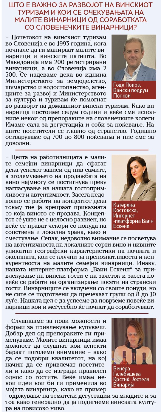 Македонските мали винарници треба да развиваат сопствена и автентична приказна и да создаваат повисока додадена вредност со примена на концепт на директна продажба на виното. Во фокусот на нивното дејствување да понудат незаборавно доживување и задоволство кај посетителот на малата винарница, кој потоа ќе ја пренесе убавата винска приказна на своите пријатели. Продажбата на вино е само еден дел од работата на семејните винарници, но само со надоградување на сопственото винско производство тие можат да бидат самоодржливи на пазарот на кој владее голема конкуренција. Ова се главните препораки од словенечките винари до претставниците на македонските мали винарници, кои имаа можност да ја следат дводневната работилница за подигнувањето на капацитетите и на активностите во винскиот туризам, која се одржа минатиот месец во Винскиот музеј Кавадарци.