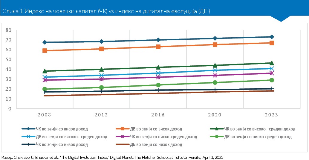 Во тој контекст, оваа статија го анализира извештајот Digital Planet 2025 кој содржи податоци за состојбата на човечкиот капитал, за инфраструктурната подготвеност, за институционалното окружување и иновации и промени за 125 земји во периодот од 2008 до 2023 година, како 4 клучни фактори за дигитализација на националните економии (индекс на дигитална еволуција). Фокусот е на доходовните групи со цел да се прикажат структурните причини поради кои човечкиот потенцијал не се претвора во одржлива дигитална вредност.