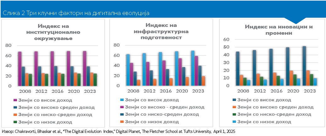 Кај земјите со среден доход, иако човечкиот капитал напредува стабилно, слика 2 покажува дека инфраструктурната подготвеност (на пр. комуникациска, поштенска и транспортна инфраструктура, брзина на интернет, електронски плаќања и сл.), институционалното окружување (на пр. правна рамка за ИКТ-секторот, национална стратегија за вештачка интелегенција и широкопојасна дигитална инфраструктура, ефективност на институции и транспарентност и сл.) и капацитетот за иновации и промени (на пр. достапност до кредити и ризичен капитал, процедури и трошоци за стартапи, % на истражувачи и инженери и сл.) не се развиваат со ист интензитет. Ова укажува дека проблемот не е во достапноста на човечкиот капитал, туку во системите што треба да го поддржат. Кога инфраструктурата е ограничена, институциите нефункционални, а иновациите слабо поттикнати, човечкиот потенцијал останува неискористен и не се претвора во реална дигитална вредност. Наместо класичен одлив на мозоци (brain drain), доминира појавата на неискористен човечки капитал (brain waste) кој не е интегриран во продуктивни дигитални активности.
