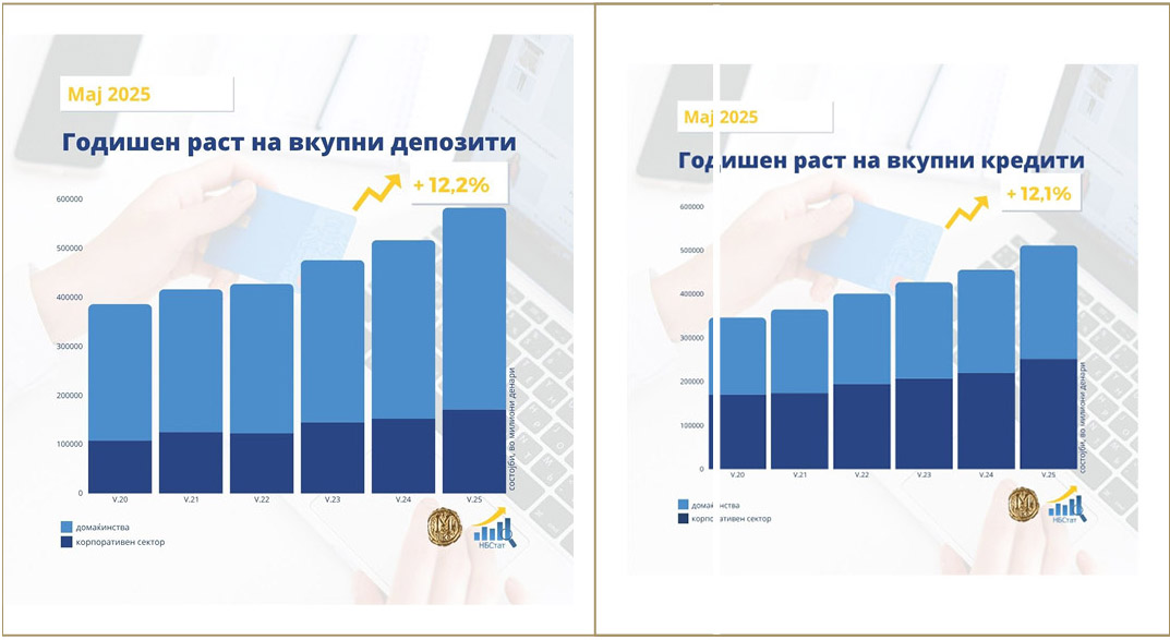 Во мај: Годишен раст од 12,2% на вкупните депозити и од 12,1% на вкупната кредитна поддршка