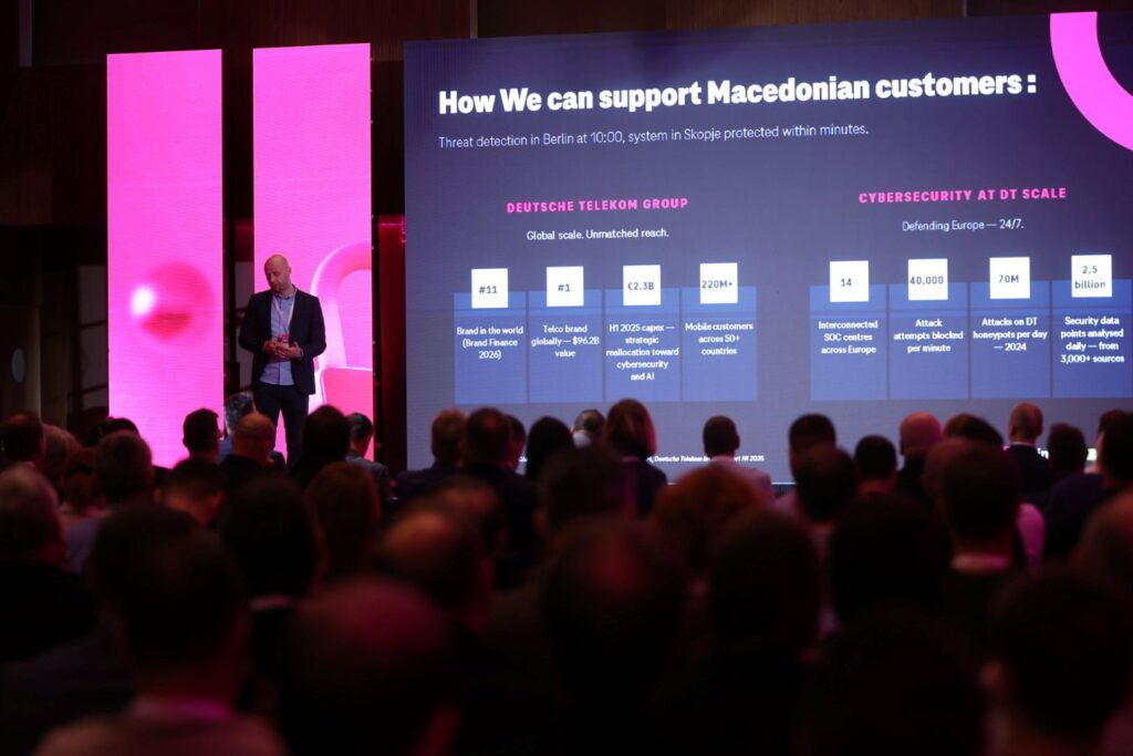 Во рамки на конференцијата, експерти од Дојче Телеком и ги презентираа најновите глобални трендови во сајбер безбедност и споделија конкретни решенија и практики за заштита од сајбер закани.