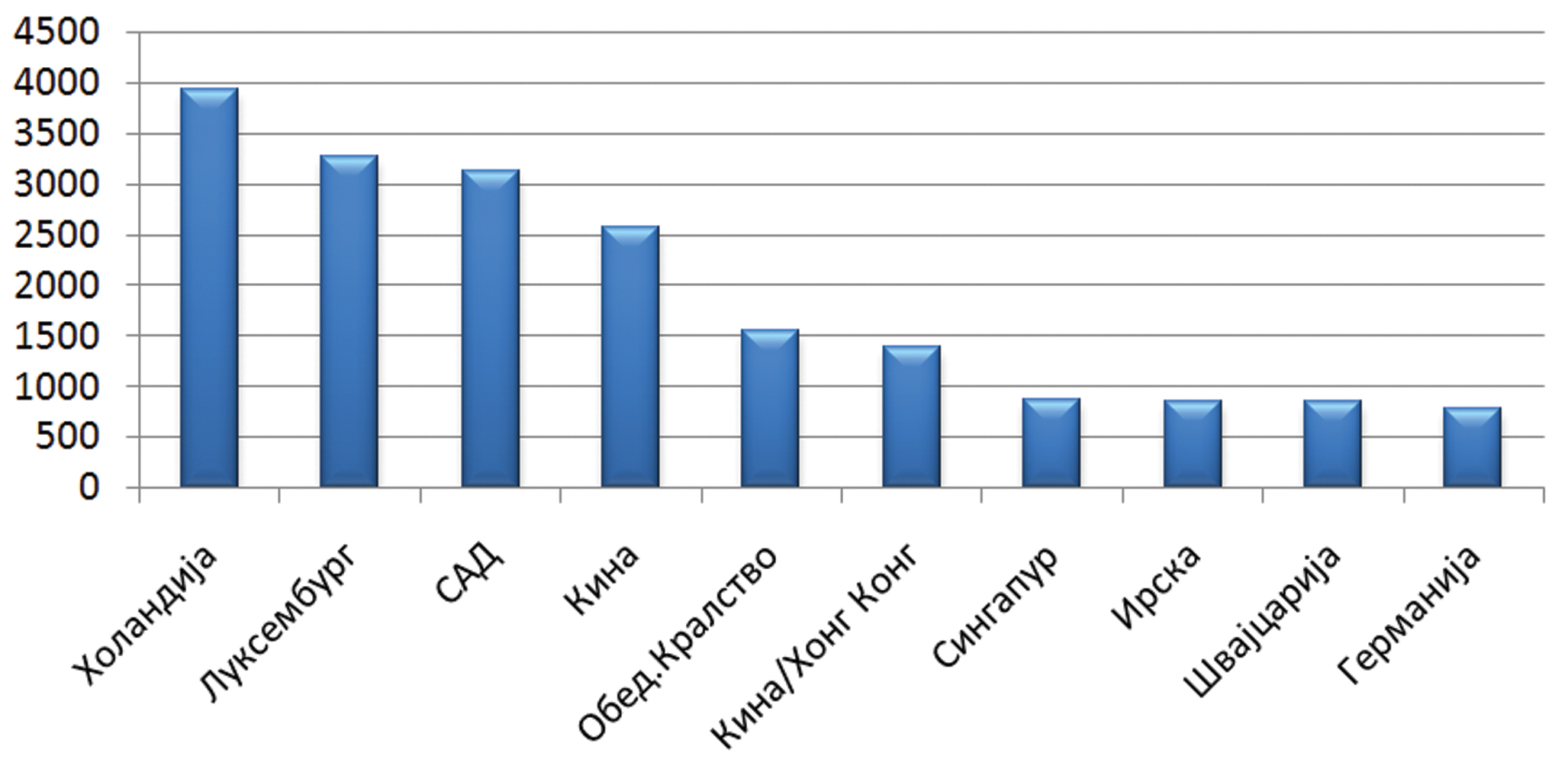 Вториот графикон покажува кои земји се најголеми приматели на странски директни инвестиции во светот. Не е изненадување тоа што се работи за речиси истите земји од првиот графикон. Прилекува внимание фактот дека Кина (делот без Хонгконг) се појавува во оваа група, а ја нема во првиот графикон. Истото важи и за Сингапур. Карактеристично е и тоа дека трите највисоко рангирани земји од вториот графикон имаат помало учество во вкупниот износ на примени странски директни инвестиции (53,7 %) во споредба со трите земји најголеми инвеститори од првиот графикон (60,7 %).