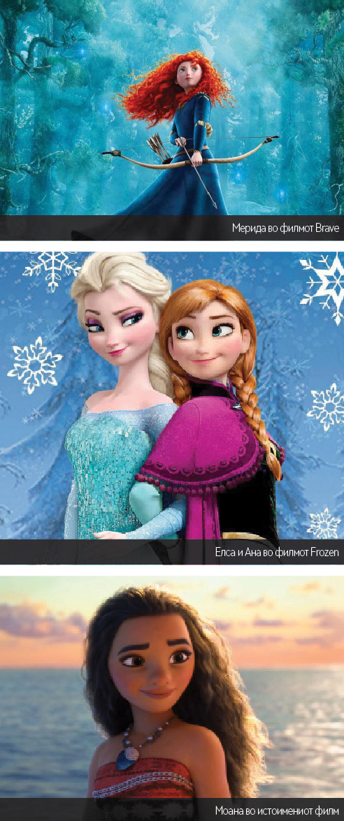 Современите Дизниеви филмови вртоглаво направија пресвртница во раскажувањето на приказните и успеаја да привлечат поширок спектар на општествено свесна публика. Женските протагонисти повеќе немаат пасивна и подредена улога. Имаат избор да донесуваат самостојно одлуки, прво на глас кој самите го имаат извојувано. Целата застарена идеолошка матрица денес е трансформирана во нешто сосема друго. Доколку во минатото Пепелашка, Снежана и Трнорушка сонуваа за бакнеж од принцот кој ќе ги спаси и конечно ќе стави прстен на нивната рака, денешните модерни хероини Моана, Елса, Ана, Мерида... не чекаат да бидат спасени и друг да им го бере гајлето. Тие се храбри индивидуи, бунтовнички со големо срце, па затоа и ја поткопуваат стереотипната логика дека жената е само декор во домот, чија единствена цел е да ја омажи „принцот“.