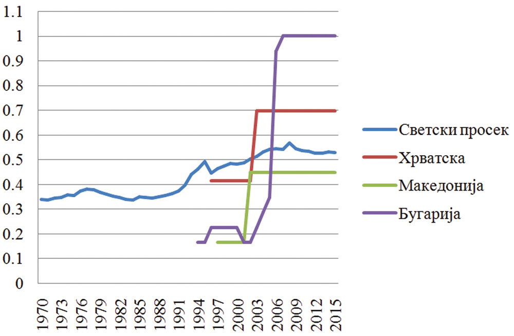 Графикон бр. 2. Либерализацијата на капиталните трансакции во светот и во одбрани земји од Југоисточна Европа (0=финансиска автархија; 1=слободно движење на капиталот)