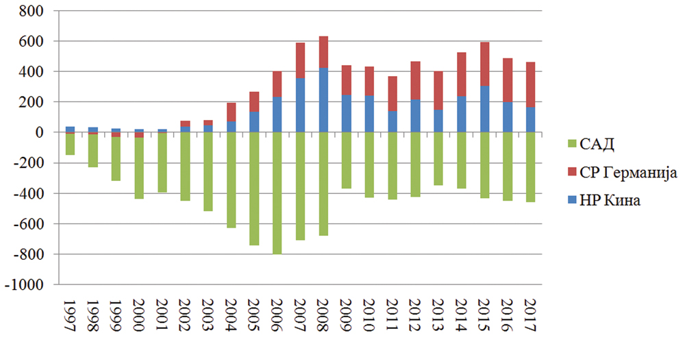Драматичниот растеж на финансиската глобализација во втората половина на деведесеттите години од минатиот век и почетокот на XX век беше придружен со досега незапаметени платно-билансни нерамнотежи во светот (т.н. глобални дебаланси). Финансиската либерализација овозможи поефикасно распоредување на штедењето во светски рамки, односно непречено вложување во оние сектори и економии кои имаа потенцијал за брз растеж и ветуваа повисоки стапки на принос. Но, тоа предизвика и продлабочување на дефицитот на тековната сметка во земјите должнички и истовремено зголемување на суфицитот во земјите кредитори. Во моментов постои голем револт кон економиите кои остваруваат трговски суфицит (како на пример НР Кина и СР Германија), бидејќи неговото огледало е значаен трговски дефицит во економиите како на пример САД (графикон бр. 3). И додека човек може да наиде на разбирање за критиките за прекумерното трошење и големиот трговски дефицит на САД или на некои членки на еврозоната, тешко дека може да се најде убедлива критика за преголемото штедење и големиот трговски суфицит на конкурентните економии како на пример СР Германија.