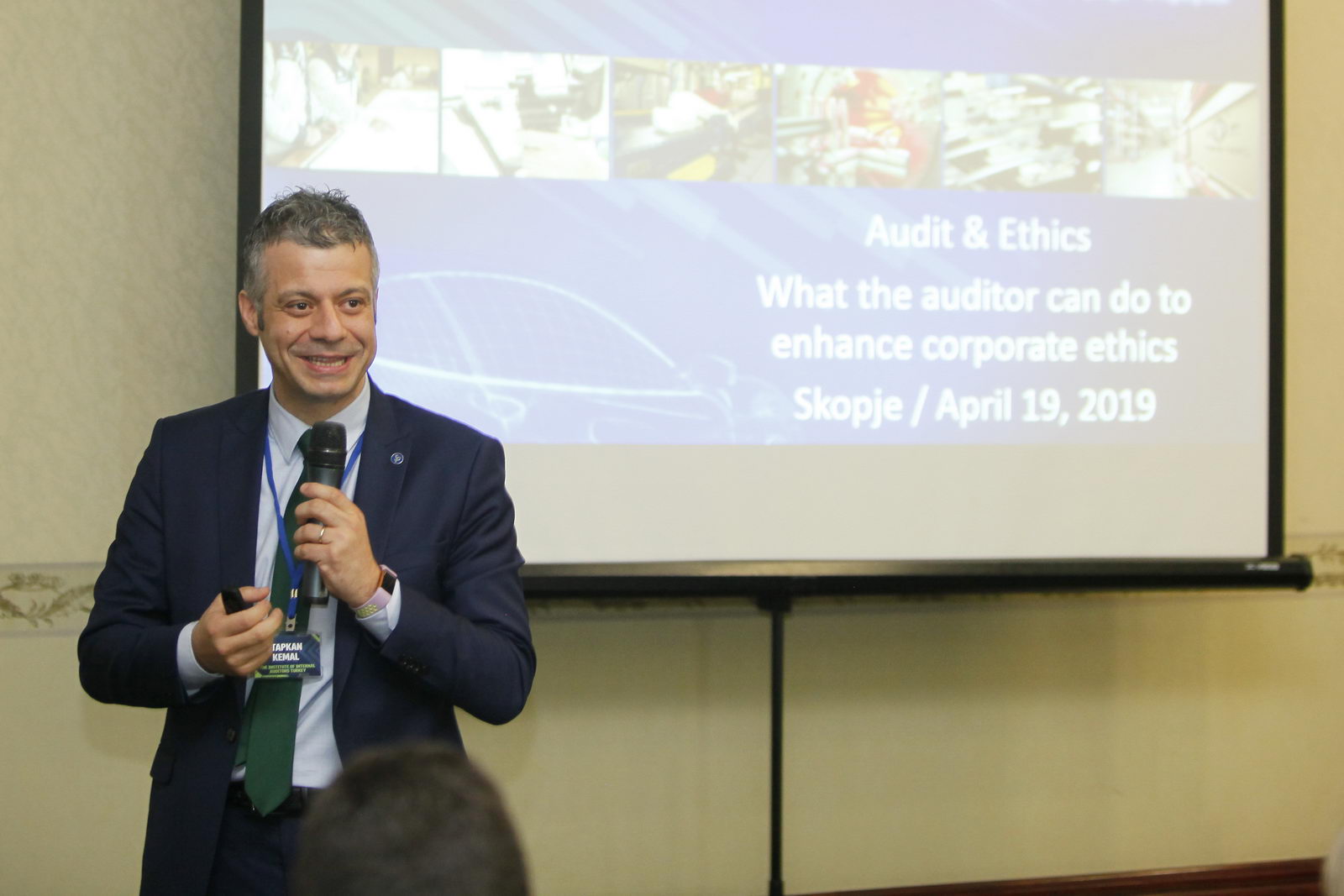 - Г-дин Epaminondas Chandros, O.T. Senior Manager, Attica Group, кој ја предизвика публиката со практична дискусија за поврзаноста помеѓу внатрешната ревизија, сениор менаџментот и Одборот за ревизија, како три “различни светови” кои треба блиску да соработуваат во остварувањето и заштитата на интересите на корпорациите и нивните акционери.