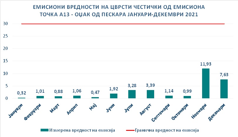 Регистрираните вредности, на двете мерни точки се пониски и од дефинираните гранични емисиони вредности во А-интегрираната еколошка дозвола и од пропишаните европски гранични емисиони вредности. Ова е потврдено и од Државниот инспекторат за животна средина при чијашто контрола е констатирано дека нема отстапувања на емисиите од дозволените вредности. Инаку, Државниот инспекторат за животна средина во текот на целата година врши чести како најавени, така и ненајавени контроли на контролните точки.