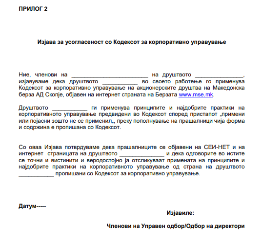 Органот на управување на издавачите е должен во рамките на Годишниот извештај за работење на друштвото како негов составен дел да даде Изјава за примена на Кодексот за корпоративно управување.
