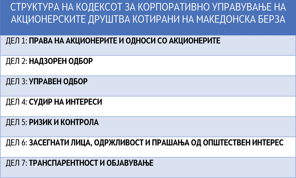 Македонска берза во Кодексот ги пресликува најдобрите меѓународни практики на корпоративно управување и гради патоказ за добра корпоративна репутација на македонските акционерски друштва и надминување на констатираните недостатоци3. Законските одредби се покажуваат како недоволни, па Кодексот поставува повисоки стандарди од задолжителните барања.