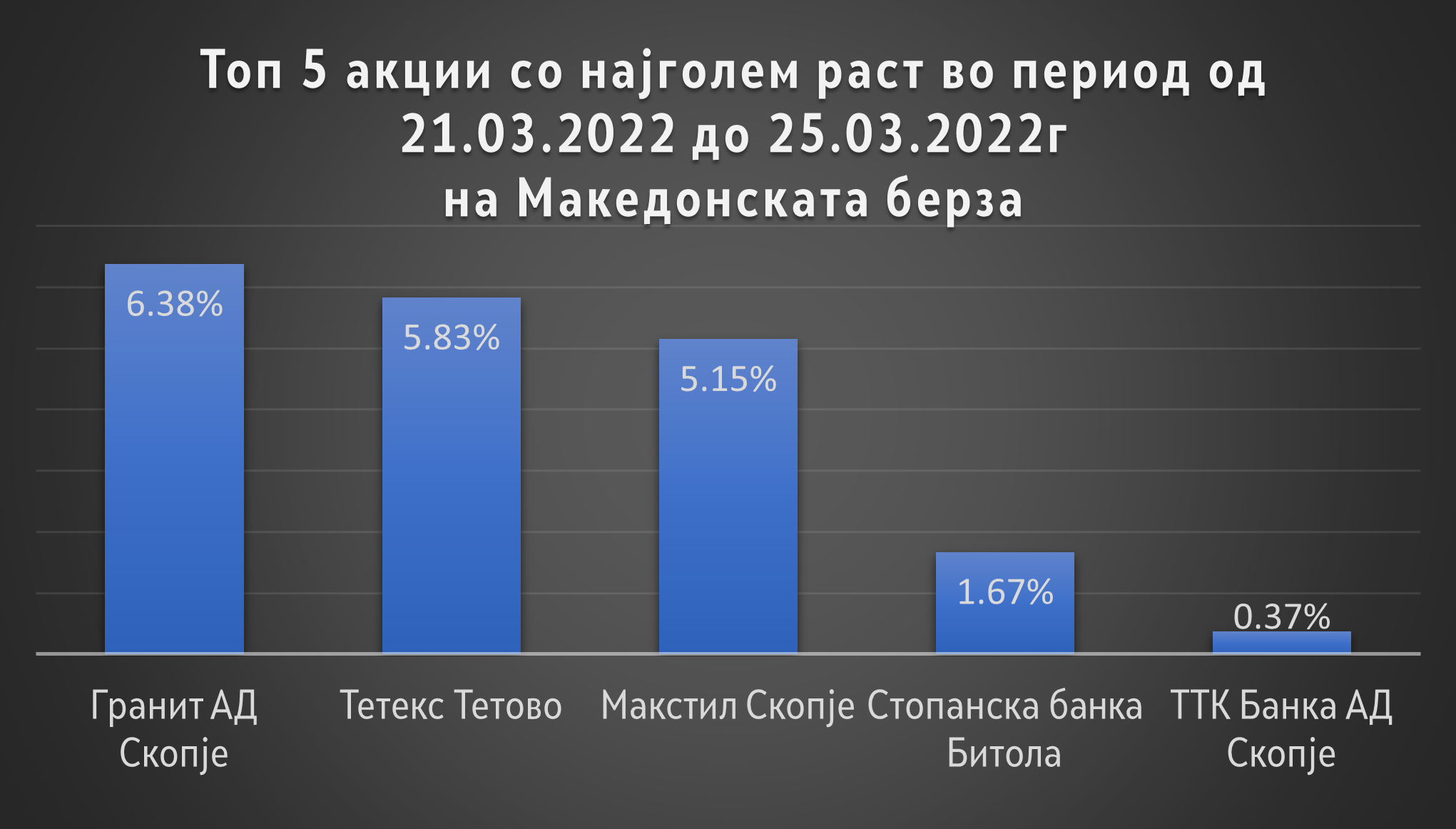 Според вредноста на остварениот промет, минатата недела, во периодот од 21.03.2022 до 25.03.2022 година, на Македонската берза на хартии од вредност најтргувани беа акциите на Комерцијална банка АД Скопје. Со нивното тргување беше остварен промет од 16,7 милиони денари или околу 272 илјади евра (23,4 % од вкупниот промет). Втори најтргувани акции измината недела беа акциите на Алкалоид со вкупен промет од 8,6 милиони денари или околу 140,6 илјади евра (12,1 % од вкупниот промет). Потоа следуваа акциите на НЛБ Банка АД Скопје со 8 милиони денари или околу 131,1 илјади евра (11,3 % од вкупниот промет). Во топ 5 акции според прометот изминатата недела беа уште и акции на Тетекс Тетово со 5,3 милиони денари или околу 87,3 илјади евра и акциите на Макпетрол Скопје со промет од 4,8 милиони денари или 78,8 илјади евра.