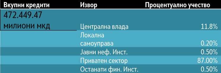 - Процентуалното учество на приватниот сектор е доминантно во вкупната пропорција на кредити со 87%. На второ место е централната влада со 11.8%, додека останатите извори се со “маргинална” големина.