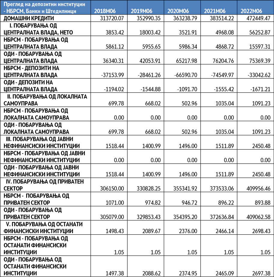 Кога станува збор за вкупниот долг кој циркулира во депозитните институции, често има различни толкувања за нивото на побарувања и нивото на депозити. Скоро секоја економија има свои специфики во зависност од поставеноста на монетарнта економија, економскиот циклус во кој се наоѓа одредена економија (дали тоа е економски просперитет или рецесија), адекватноста на капиталот на банките, висината на каматните стапки и ред други специфики кои го одредуваат нивото на задолженост. Притоа, под депозитни институции спаѓаат централната банка, банките и штедилниците. Сите тие заедно со вкрстени трансакции го сочинуваат домашното кредитирање, а преку статистичкиот преглед на НБРСМ може да ги издиференцираме најбитните компоненти за подобро да ги визуелизираме тековите.