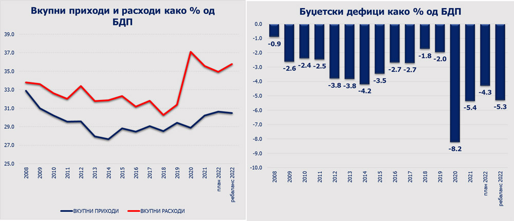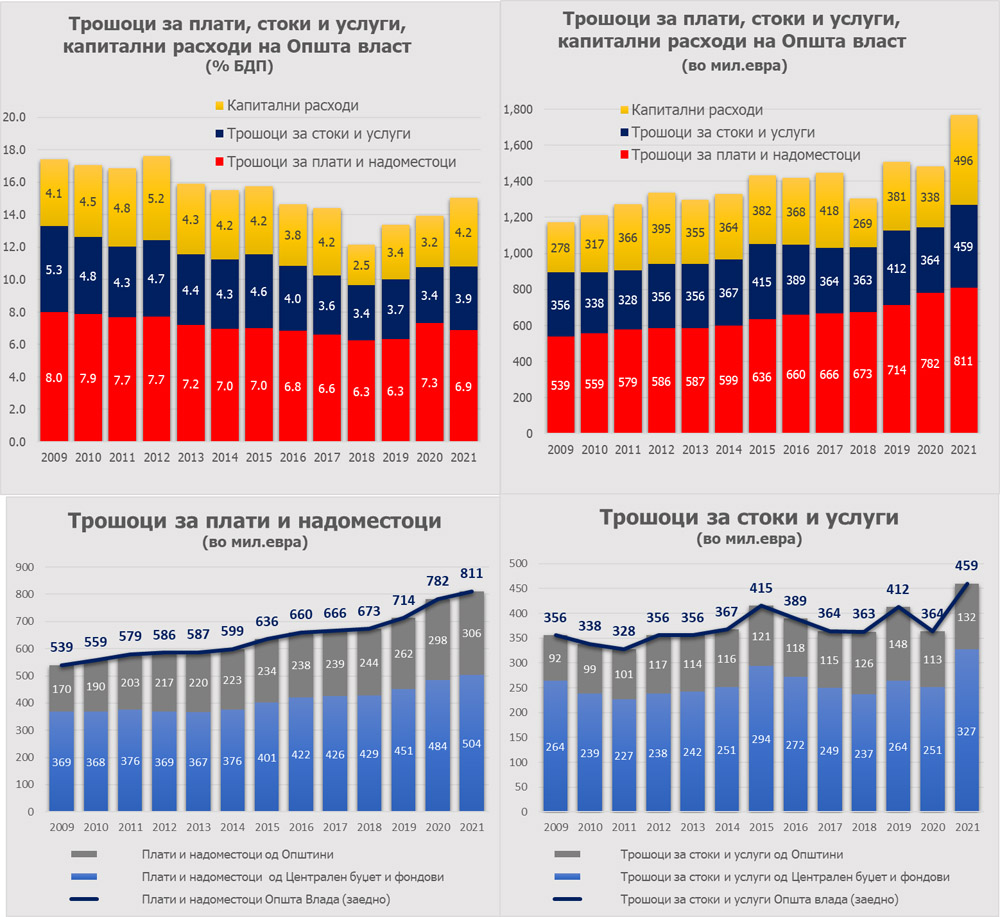 За оправданоста на даночната реформа. Даночната реформа за да биде кредибилна и прифатена од бизнис-заедницата и од населението треба да биде истовремено поддржана со јасна посветеност на Владата дека ќе штеди на непотребни набавки, дека ќе настојува да ја рационализира јавната администација, дека ќе настојува да го намали коруптивното однесување на носителите на јавни функции. Јасната посветеност за фискална консолидација на расходна страна не е нешто што треба да се разговара од сега натаму, туку требаше да постои и досега. Кризата со пандемијата не требаше да се гледа како матна зона за вработувања во јавниот сектор и за нерационално трошење за стоки и услуги. Сметката за ваквата политика допрва ќе се плаќа. Зарем во услови на голема економска криза за 2020 и 2021 година требаше масата на плати за јавната администрација да се зголеми за фантастични 97 милиони евра? И тука немаше раст на платите, ниту позначаен раст на минималецот, што значи дека овој раст е поради новите вработувања во јавниот сектор. Зарем требаше во сред голема економска криза дискреционите трошења на Владата за стоки и услуги да се зголемат за 47 милиони евра? Или требаше да се штеди? Трошоците за плати и надоместоци на општата влада (централна влада, фондови и општини) во 2021 година достигнаа фантастични 811 милиони евра, а за трошења за стоки и услуги фантастични 459 милиони евра, а со ребалансот за 2022 година уште растат?! За споредба, капиталните расходи на општата влада во 2021 година изнесуваа 496 милиони евра, а само на централната влада се 381 милион евра, од кои само 102 милиони евра се за градежни работи!!!