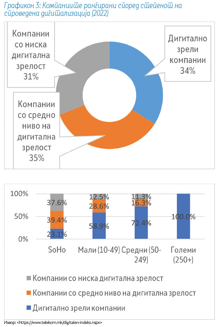 Во сегментот на компании, употребата на ИКТ е силно поврзана со големината на компанијата при што микро и малите компании во голема мера заостануваат зад големите и средните. Македонските бизниси чувствуваат притисок да бидат иновативни и конкурентни, но нивното целосно разбирање за потенцијалот на дигиталната трансформација е сè уште на ниско ниво. Една третина (34 %) од компаниите во Македонија во 2022 година се дигитално зрели компании, односно поседуваат технолошки и човечки капацитет да ги подобрат деловните процеси (дигитализирање на операциите) и да ги задоволат барањата на пазарот. Ова е зголемување на вкупната дигитална зрелост на македонските компании во 2021 година (28 %). Разликите во зрелоста на компаниите стануваат уште поочигледни кога податоците се набљудуваат според големината на компанијата. Сите големи компании се дигитално зрели (100 %), додека тоа е случај за само 23 % од микро компаниите (мала канцеларија/домашна канцеларија-SoHo). Сепак, ова е очигледно подобрување за сегментот SoHo од 14 % во 2021 година.