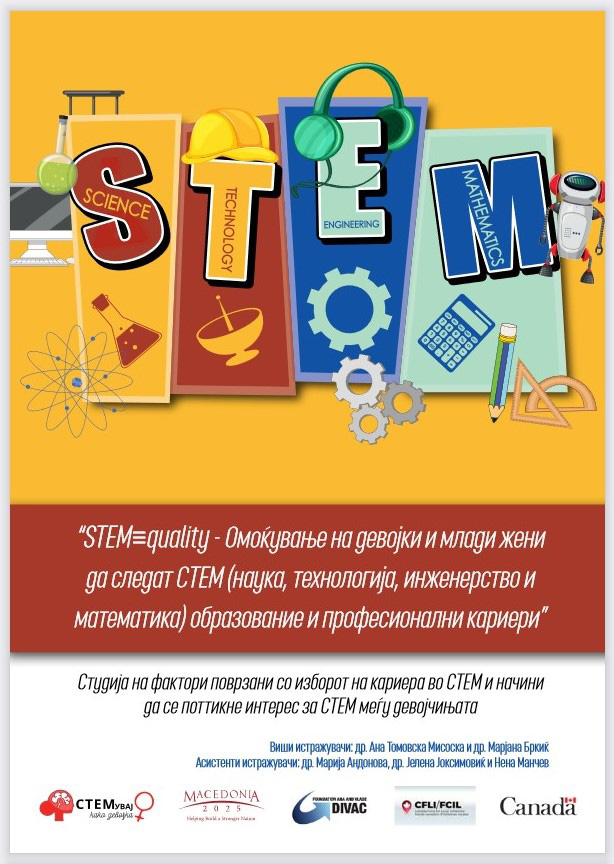 Македонија 2025, во партнерство со Фондацијата Ана и Владе Дивац oд Србија, произведе/промовира компаративна студија на фактори поврзани со изборот на кариера во СТЕМ и начини да се поттикне интерес за СТЕМ меѓу девојчињата насловена “STEM≡quality – Омоќување на девојки и млади жени да следат СТЕМ (наука, технологија, инженерство и математика) образование и професионални кариери”. Во овој документ се прикажani резултатите од истражувањето чија цел беше да се поттикне, преку презентација на успешни примери, изборот на кариера во СТЕМ кај ученичките од основните училишта од Македонија и Србија. Во студијата ја истакнуваме важноста на: (а) раните интервенции за зголемување на привлечноста на кариерата во СТЕМ бидејќи младите девојки ги ставаат своите интереси и желби како еден од најважните фактори при изборот на кариера; (б) улогата на образовниот систем не само во развивањето знаења и вештини, туку и самодоверба за кариера во СТЕМ; (в) создавање систем за поддршка за младите девојки за да го негуваат својот интерес за СТЕМ. Интервенциите за намалување на родовиот јаз во СТЕМ треба да бидат повеќенасочни и да вклучуваат промени во формалното образование во однос на промени на наставните програми за да се промовира улогата на жените во СТЕМ, да се изградат повеќе вештини и да се зајакне довербата поврзана со поседување вештини и создавање подобар систем за поддршка на кариерното советување и поддршка.