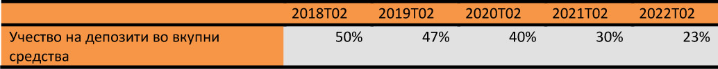 2. Депозитите како инструменти каде се пласирани средствата на инвестиционите фондови зафаќаат значителна пропорција. Но, изминативе 4 години се одличен пример преку кој може да се долови атрактивноста на овој производ. Имено, ако во К2 2008 учеството на депозитите во вкупните средства било 50%, тоа ниво во К2 2022 година е доведено до 23%.