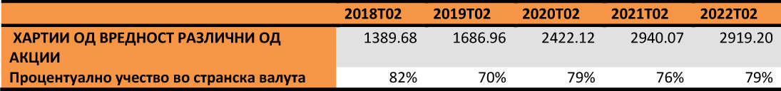 3. Хартиите од вредност различни од акции се вториот елемент во структурата. Кај нив во анализираниот период се забележува позитивен пораст, со тоа што главно овие пласирања се одвиваат на странски пазари во странска валута. Процентуалното ниво низ сите овие 4 години било околу 80%, со еден екстрем во 2019 година, кога ваквите позиции учествувале со 70%.