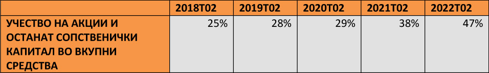 5. Бидејќи износи на страната на обврските скоро и да не постојат, равенството се израмнува преку капиталните сметки. Имено, доминантно учество имаат сопственичките вложувања кои достигнаа ниво од 9.121 милиони мкд, додека остатокот се надополнува со задржаната добивка(која е во пораст секоја година и достигна ниво од 1.408 милиони мкд во К2 2022 година) и добивката од тековната година(која последниот квартал е најмала во износ од само 91 милион мкд, но сепак е подобра ситуација од негативниот резултат остварен во К2 2020 година).