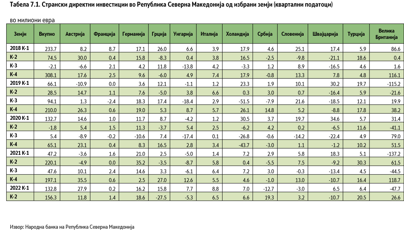 - 8. Што се однесува на првите 2 квартали од 2022 година за одбележување се новите инвестиции од Австрија и Германија во износ од 39.7 и 34.8 милиони ЕУР, но во исто време нарушен е трендот во односите со Грција каде е евидентиран негативен резултат од 11.7 милиони ЕУР, како и минусот од 21.1 милиони ЕУР од најголемиот инвеститор Велика Британија.
