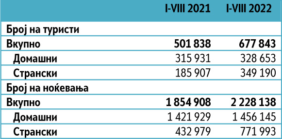Според податоците од табелата може да се забележи дека вкупниот број на туристи се зголемил за 35%, или 176.005 повеќе туристи, во споредба со истиот период лани, се евидентирани во туристичките капацитети. Од нив 52% биле домашни, додека 48% странски туристи. Овој податок е значителен од причина што изминатата година главниот извор биле домашните туристи кои партиципирале со 63%. Ваквите бројки се и за очекување ако се земат во предвид сите ограничувања од ковид кризата и државната стимулација на домашниот туризам. Од друга страна, иако процентот на странски туристи се зголемил за 87%, сепак тоа не било проследено со рамномерен пораст на бројот на ноќевања, кои пораснале за 78%.