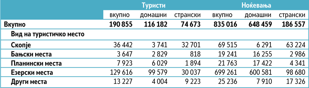 Првата категорија ни открива дека најпосетени биле езерските места со вкупно 129.616 туристи, од кои ¾ биле домашни туристи. Тукму на овие локации реализирани се и најголем дел од ноќевањата, односно 92% од вкупните ноќевања. Интересно е да се забележи дека во месец август странските туристи повеќе го посетувале Скопје отколку езерските места, а таа разлика изразена во апсолутна бројка изнесува 2.664 туристи. Меѓутоа, иако помалку странски туристи се одлучиле за посета на езерските места сепак нивниот престој таму бил подолг. За 36% е поголем бројот на ноќевања на странски туристи на езерските места, во споредба со нивните ноќевања во Скопје.