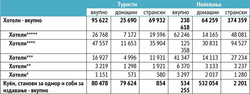 Од аспект на хотелското сместување најголем дел од туристите и ноќевањата се реализирани од странски туристи. Од аспект на туристите, соодносот помеѓу домашни и странски е 26/74, а идентичен сооднос е евидентиран и кај ноќевањата. Најкористени хотелски капацитети се оние со 4 ѕвезди позади своето име, а таквата констатација се однесува и за домашните, но и за странските туристи.