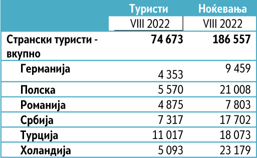 Од аспект на странските туристи во продолжение е табела со 6-те држави од каде доаѓаат најголемиот број на туристи.