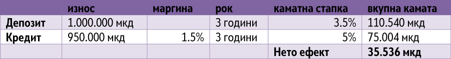 Од табелата погоре може да се забележи дека клиентот ќе има нето позитивен ефект од 35.536мкд, на крајот на периодот, а притоа не ги искористил своите средства. Вкупната камата која банката ќе ја исплати на депонираните средства е за 32.2% повисока од она што клиентот ќе го врати на банката по основ на камата за кредитот.