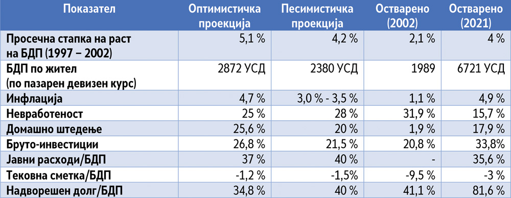 За движењата на македонската економија во периодот од 1997 до 2002 година во стратегијата се дадени две сценарија: оптимистичко и песимистичко. Двете проекции се прикажани во табелата бр. 1, заедно со остварените показатели. Покрај тоа, за да се добие груба претстава каде се наоѓа Македонија 25 години по изработката на стратегијата, во табелата се прикажани и основните макроекономски показатели за 2021 година.
