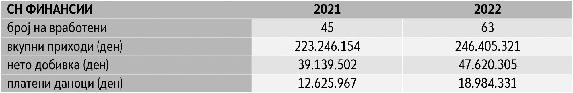 Финансиското друштво СН Финансии е првата финтек компанија во Македонија со домашен капитал, кое на пазарот е препознаено како лидер во иновациите. Би истакнал дека нашата стратешка определба е на граѓаните на Македонија да им понудиме современи услуги во склад со дигиталното секојдневие во кое реално живееме. Во таа смисла имплементираме онлајн работење уште од самиот почеток. За нас работи тим на ИT-експерти кои развија посебни продукти и решенија базирани на принципите на вештачката интелигенција, при што уште од почеток за кредит се аплицира онлајн, одобрувањето го прави виртуелна комисија, оди премногу брзо и овие услуги се мерат во минути.