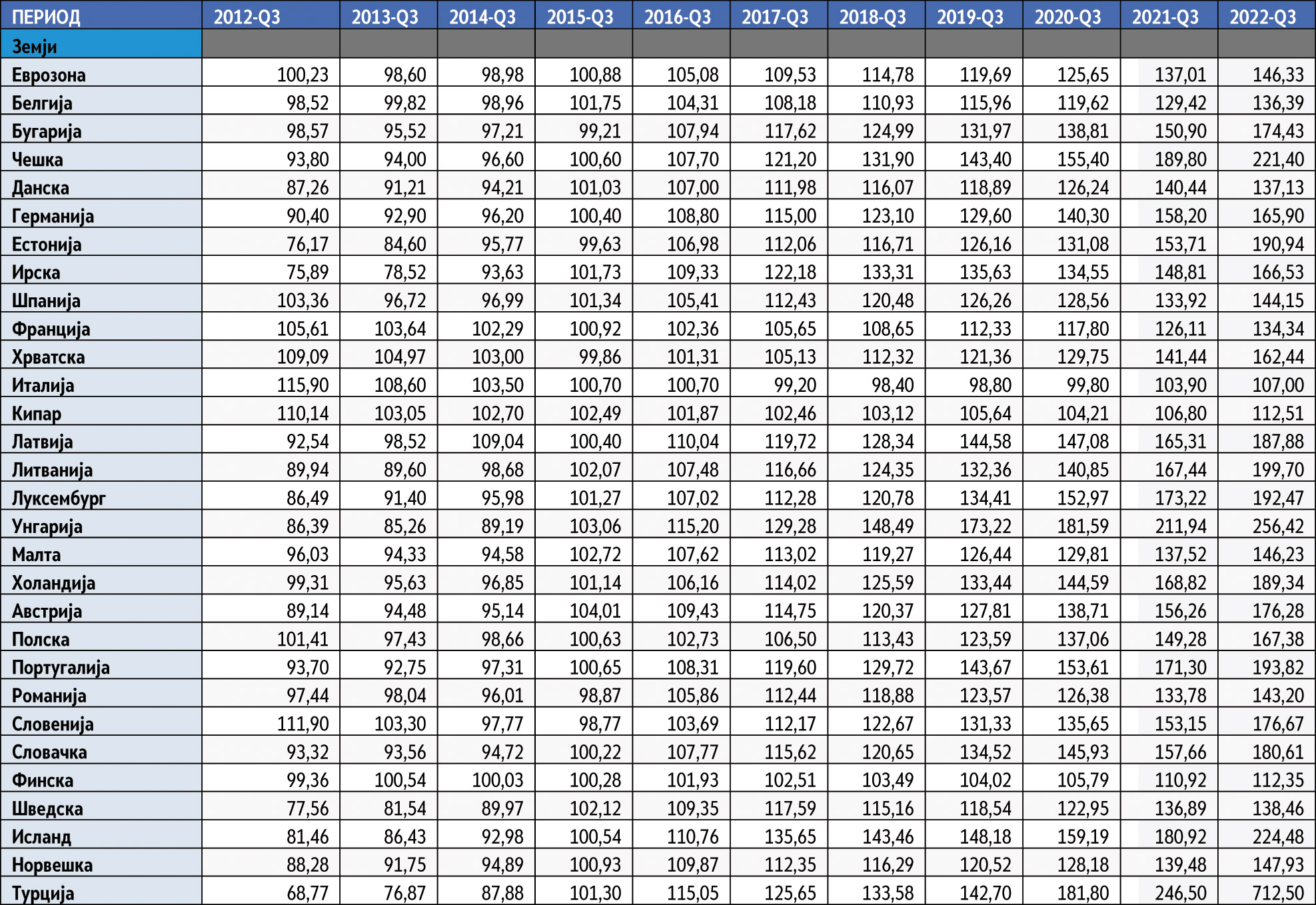 Токму поради големата волатилност на цените во изминативе неколку години ќе се обидеме да направиме анализа на движењето на овој индекс во најголемиот број европски земји. Притоа користени се податоци од Евростат (Eurostat), а како референтна вредност е третиот квартал (кв. 3) од последниве 10 години.