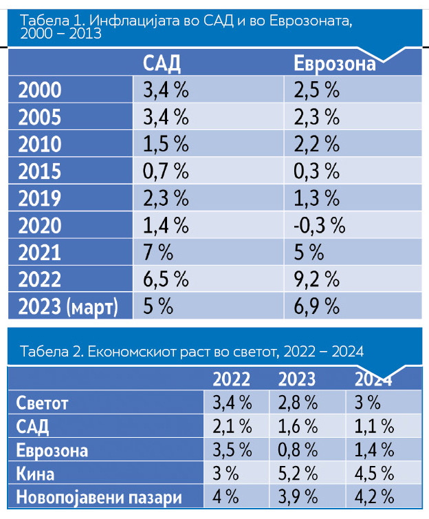 По неколкудецениското уживање во придобивките на стабилноста на цените, кон средината на 2021 година, а особено во текот на 2022 година, светот го зафати плимата на инфлацијата надополнета со опаѓање на економската активност. На пример, инфлацијата во САД го достигна врвот во јуни 2022 година (9,1 %), највисоката инфлација во Еврозоната беше забележана во октомври 2022 година (10,6 %), а на крајот од 2022 година инфлацијата во Македонија изнесуваше 18,7 %. Потоа инфлацијата се намали, но таа е сѐ уште далеку над посакуваното ниво од 2 %, што е цел на централните банки во развиените земји (табела 1). Паралелно со високата инфлација, светот се соочува со намалување на стапките на раст на БДП, а тоа особено се однесува на развиените земји (табела 2). Бидејќи економистите сакаат да измислуваат нови зборови, таквата комбинација на низок економски раст и висока инфлација ја нарекуваат стагфлација (стагнација плус инфлација).