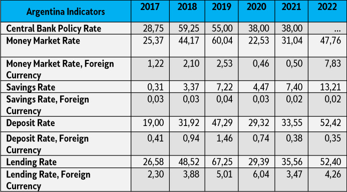 Се чини дека Аргентина ги поминува најкризните моменти, а со тоа економските показатели и трендови имаат тенденција на рушење на економијата. Иако се чинеше дека во 2020 година трендот на камaтните стапки ќе продолжи да се намалува, сепак пандемијата си го направи своето и повторно ги “подигна” каматните стапки на неподносливо ниво. Така, каматната стапка на централната банка својот пик го имаше во 2018 година, кога достигна ниво од скоро 60%, додека со последните расположливи податоци од 2021 година, изнесувала 38%. Поголеми циклични движења се забележани кај пазарната каматна стапка која по падот во 2020 година на 22.5%, се искачи до 47% кон крајот на 2022 година. Ваквиот скок претставува пораст за 58п.п, додека ако се анализира растот кај пазарните каматни стапки во странска валута, таму порастот е над 1.400%. Ако се прави сооднос помеѓу каматите за депозити и кредити, аргентинската економија е вистински парадокс. Имено, до 2021 година одржан е трендот каматните стапки на депозитите да бидат пониски од тие на кредитите. Најистакната разлика имало во 2019 година, кога и самите каматни стапки го достигнуваат својот врв, а гапот помеѓу нив изнесувал скоро 20%. Но тој тренд целосно се нарушил минатата година, кога каматите на депозитите ги надминале каматите на кредитите за 0.02%.