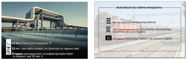П.С.Во минатата моја колумна најавив дека Комората работи и на предлагање на големи инфраструктурни проекти за искористување на компаративните предности на Македонија. Управниот одбор формира група на експерти кои заедно со Стручната служба на Комората ќе предложат соодветни решенија. На сликите подолу гледате мала статистика за железницата и веќе изградениот нафтовод.