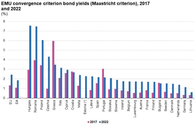 Унгарија (7,57 %), Романија (7,48 %), Полска (6,05 %) и Чешка (4,33 %) беа единствените земји-членки на ЕУ со приноси на обврзници кои беа над 4,00 отсто во 2022 година. Вкупно 13 земји-членки имаа приноси под 2,00 %.