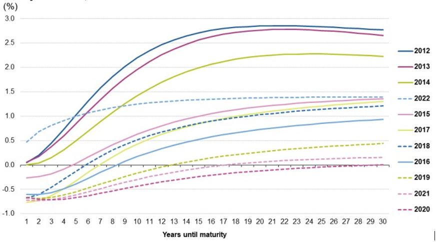 Долната слика ја прикажува кривата на приносот на еврото помеѓу 2012 и 2022 година за обврзниците на централната влада со различни години до достасување.