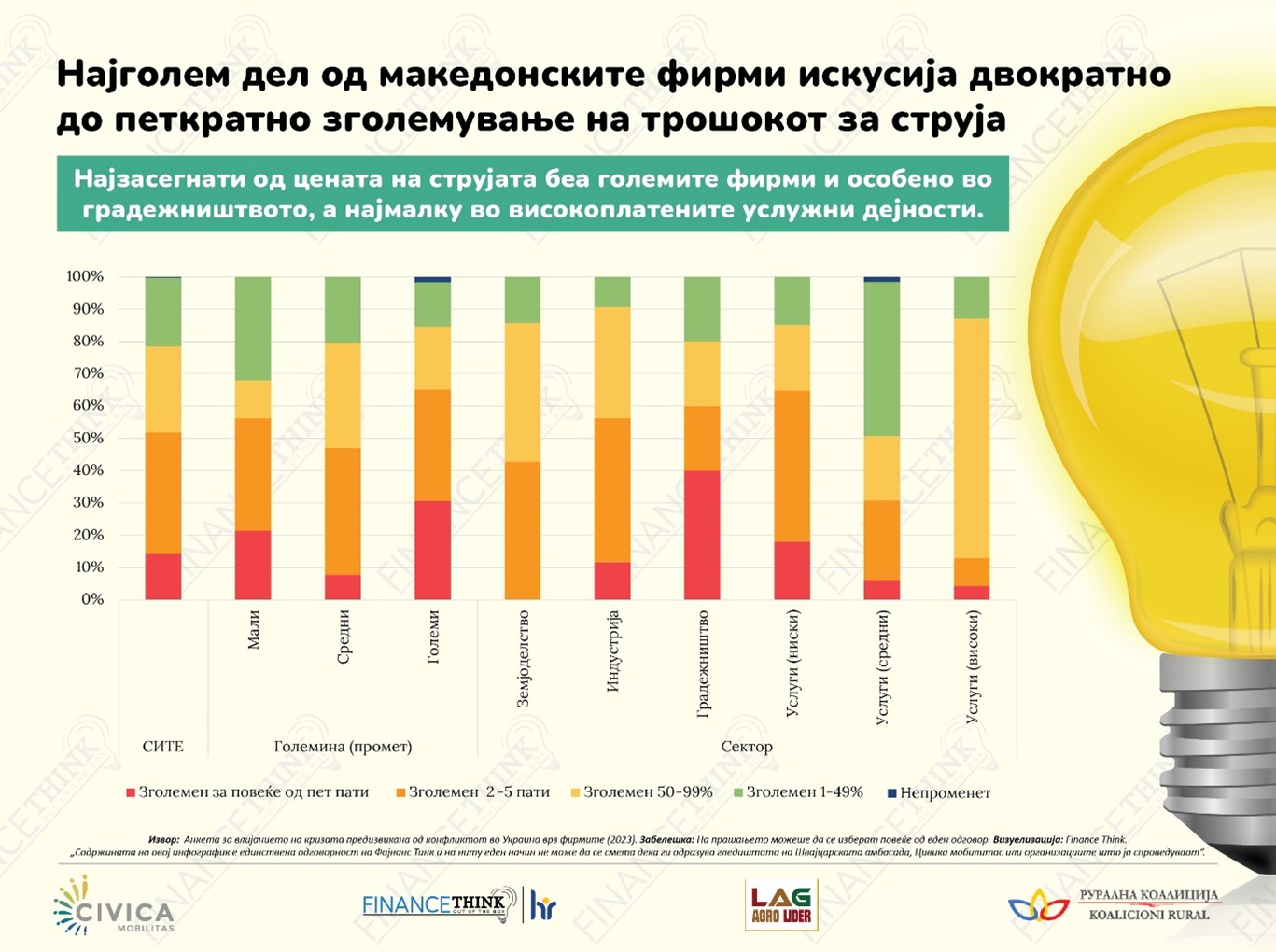 Од почетокот на годинава, Finance Think – Институтот за економски истражувања и политики прави опсежна анализа на ефектите од кризата предизвикана од конфликтот во Украина врз домаќинствата, фирмите и државата, со фокус врз некои вообичаено поранливи сегменти како жените, малите фирми и руралните области. Акцијата е поддржана од програмата Цивика мобилитас. Во еден сегмент, акцијата го проценува влијанието на кризата врз фирмите во Северна Македонија, преку сеопфатен и методолошки робустен начин продолжувајќи ја постојната дебата во земјава, со поголемо потпирање врз факти и емпириски докази. Беа прибрани податоци за 112 фирми од различни профили во текот на април и на мај 2023 година и врз нив беше извршено соодветно пондерирање според податоци од националната статистика со цел да се постигне репрезентативност на примерокот. Опфатот на прашалникот се однесуваше на ударот од кризата и начинот на справување во врска со трошоците за суровини, за енергија и за работна сила, како и проценки за побарувачката и конкурентноста во текот на кризата. Во оваа статија ќе ги изнесам главните заклучоци и ќе се осврнам накратко на тоа што може да стори Владата за да се омекнат негативните влијанија и фирмите поподготвени да дочекаат идни слични кризи.