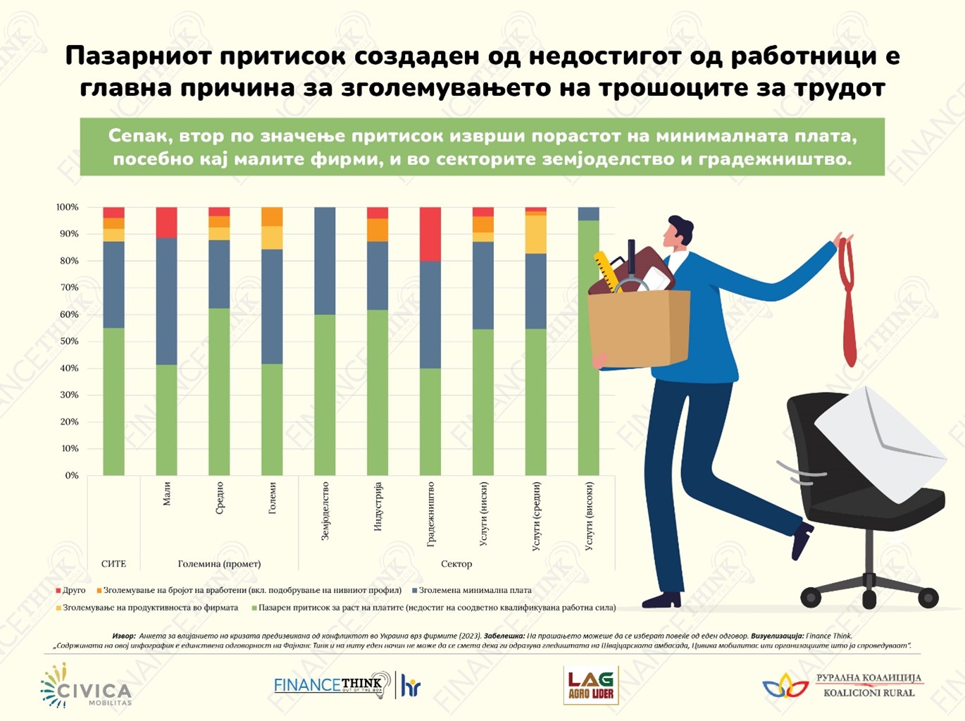 Трошоците за работна сила, исто така, се зголемија во тековната криза главно како резултат на пазарниот притисок создаден од недостигот од работна сила и вештини, проследено со притисокот што го извршија зголемувањата на минималната плата (слика 2). Последново е особено важно за малите локални фирми во нископлатежните услужни дејности. Малите локални фирми немаа осмислен начин за соочување со таквиот притисок, туку само ја пренесуваа зголемената цена врз нивните услуги и производи, што е битно за инфлаторниот притисок. Само големите компании во индустријата и во градежништвото одговорија со услуги од надворешни лица на некои процеси.