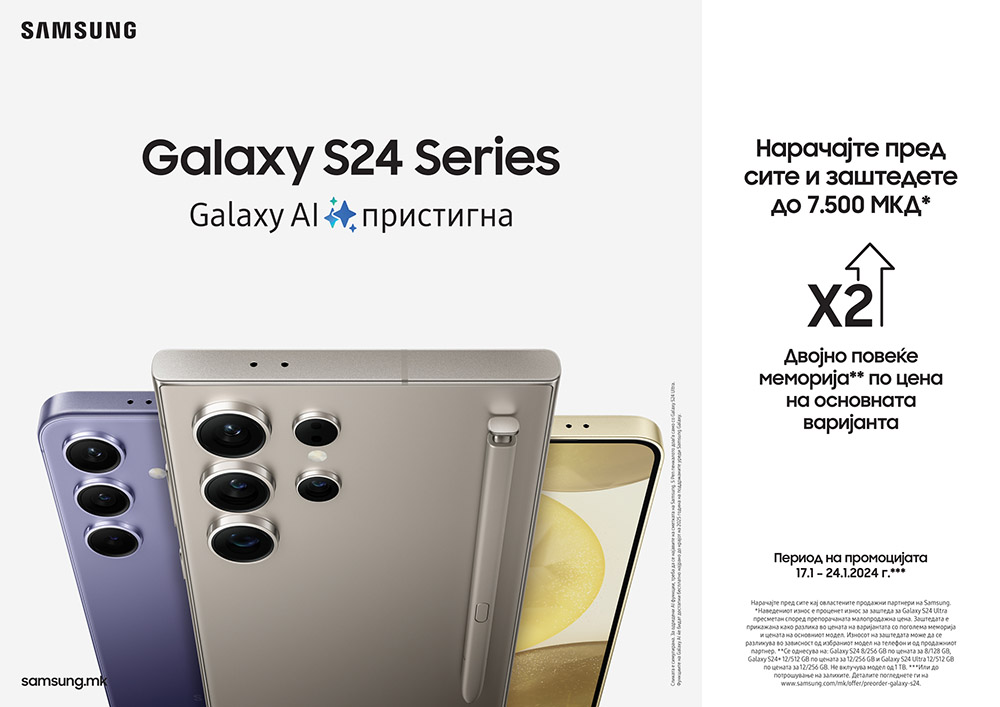 Со напредната технологија која се рефлектира во секој аспект кај уредите од серијата Galaxy S24, Samsung уште еднаш докажува дека е во првите редови на технолошката револуција која постојано го менува нашиот секојдневен живот. Искористете го периодот за преднарачка кој трае до 24.01.2024 за да нарачате еден од новите модели Galaxy S24, Galaxy S24+ и Galaxy S24 Ultra и заштедете до 7.500 денари, бидејќи добивате двојно повеќе меморија по цена на основната варијанта. Повеќе за промоцијата прочитајте тука.