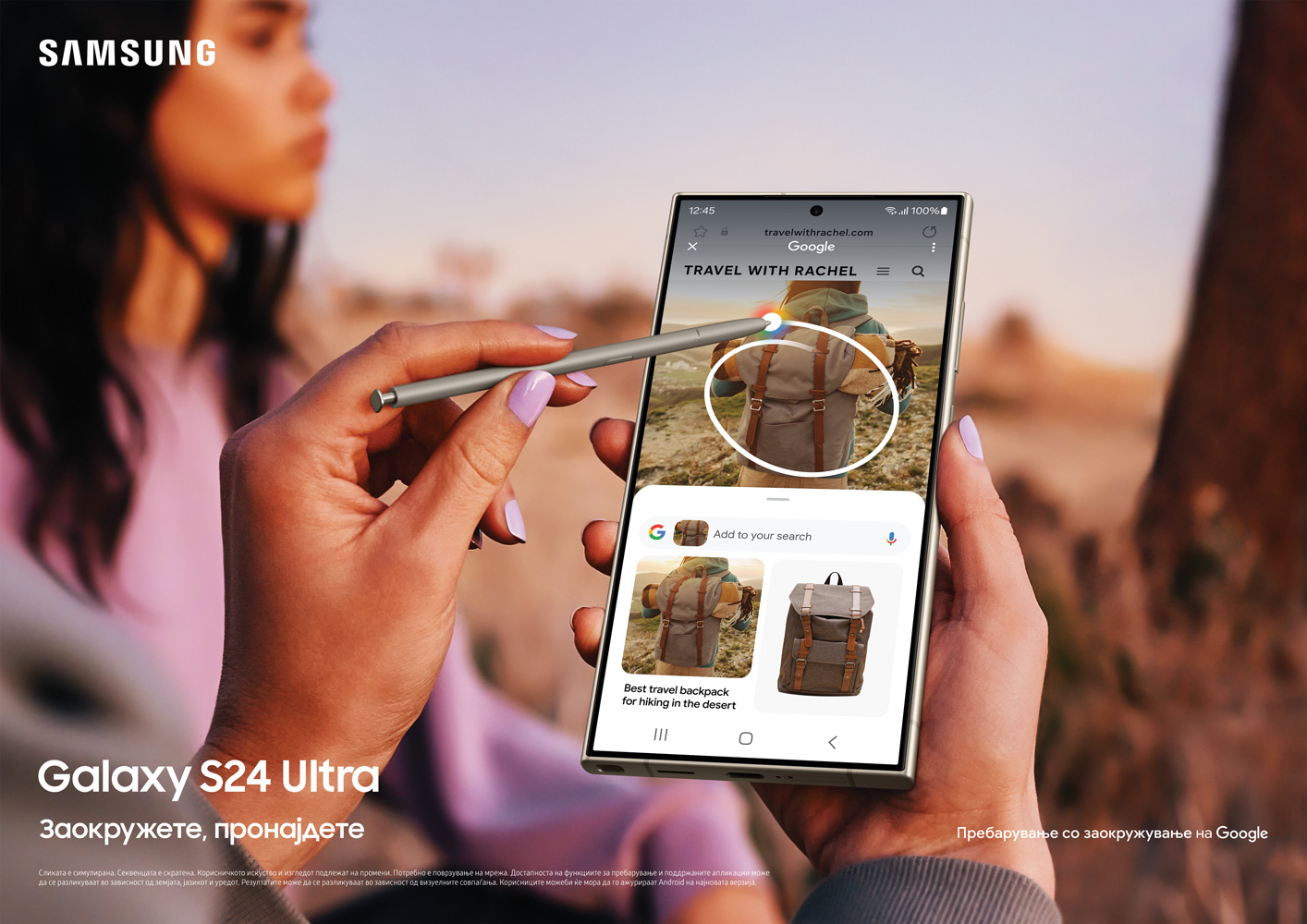 Со цел да им обезбеди на корисниците неверојатна нова алатка, Galaxy во соработка со водечкиот светски пребарувач Google, создаде нова димензија на пребарување со интуитивни гестови водени од опцијата Circle to Search (Пребарување со заокружување). Доколку забележите нешто за што ви треба дополнително објаснување, на презентација или при пребарување на Интернет, можете брзо да добиете одговор, дури и без да ја напуштите страницата! Само заокружете и барајте - да, толку е едноставно!