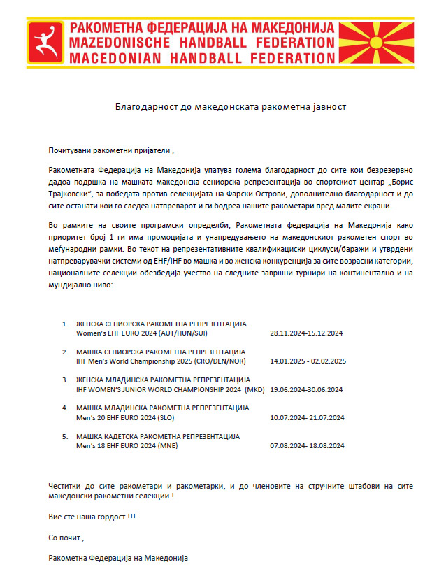 Ракометната Федерација на Македонија упати благодарност до македонската ракометна јавност